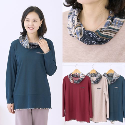 - 스카프 티셔츠 국내생산 긴팔 배색 라운드넥