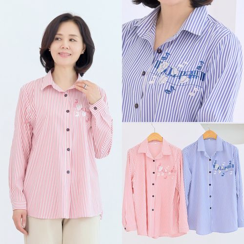 - 줄지 카라 셔츠 줄무늬 스트라이프 단추 간절기