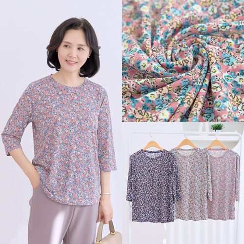 - 잔꽃 라운드 티셔츠 국내생산 7부 나염 무늬