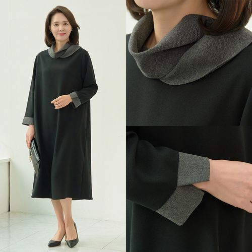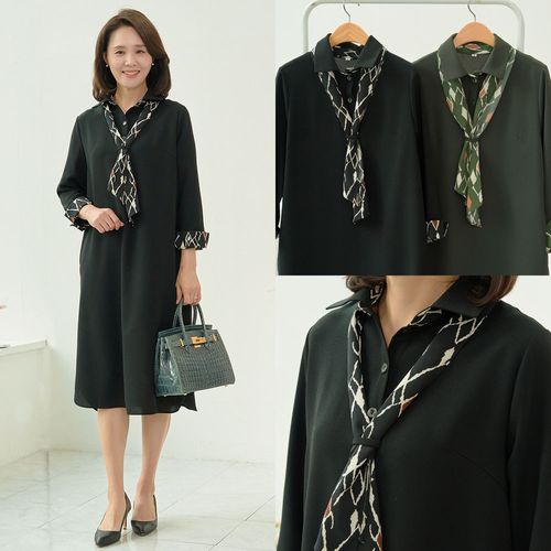 - 타이 H 원피스 스카프 카라 단추 배색 우아한 하객 정장