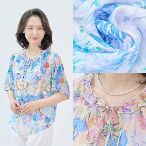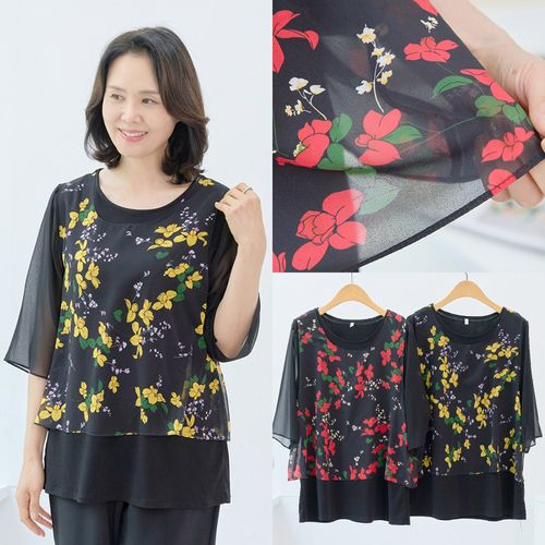 - 꽃 이중 블라우스 국내생산 하늘하늘 시스루 쉬폰