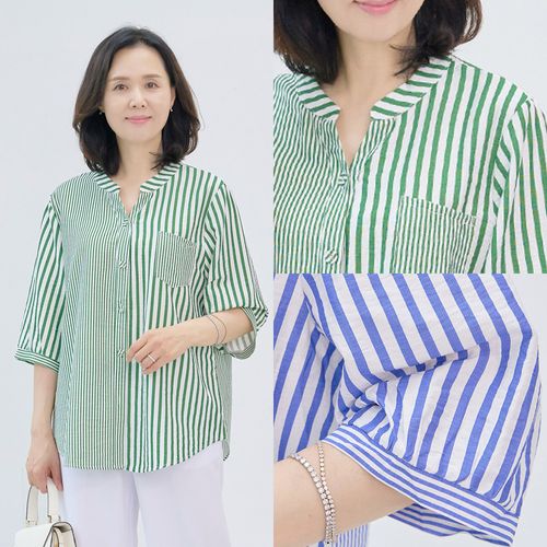 - 세로 줄 오픈 블라우스 면 차이나넥 스트라이프