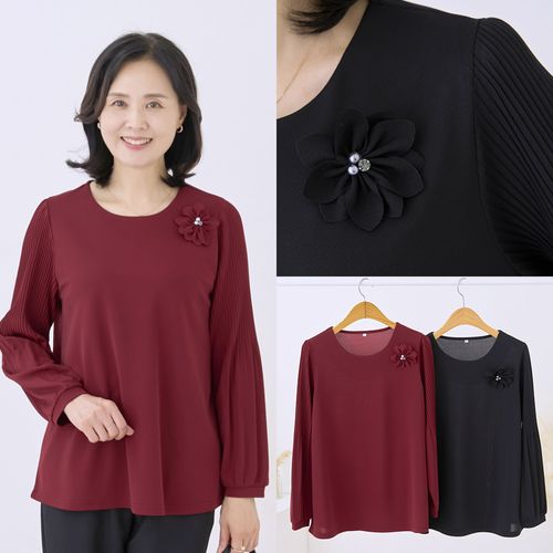 - 미소 코사지 블라우스 국내생산 긴팔 라운드 셔링