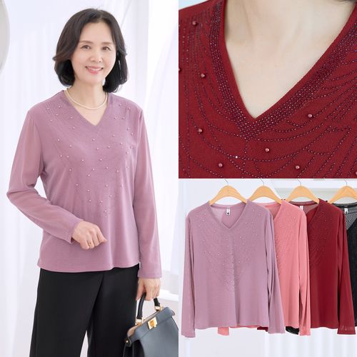 - 브이넥 진주 메탈 블라우스 비즈 긴팔 큐빅