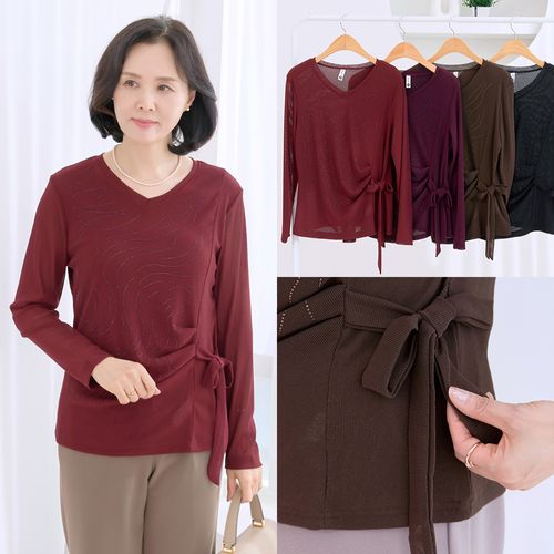 - 브이넥 시스루 블라우스 옆리본 비즈 셔링 큐빅