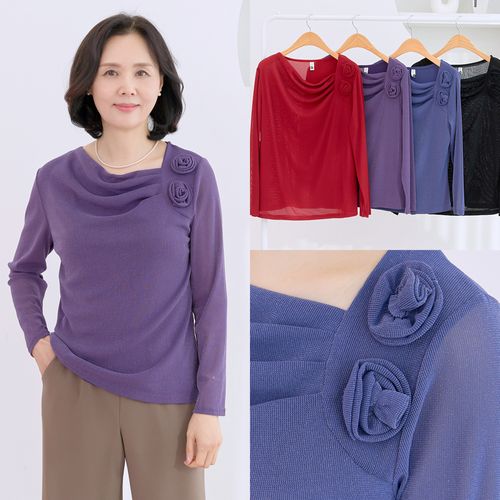 - 사선넥 장미꽃 블라우스 드레이프넥 코사지 셔링