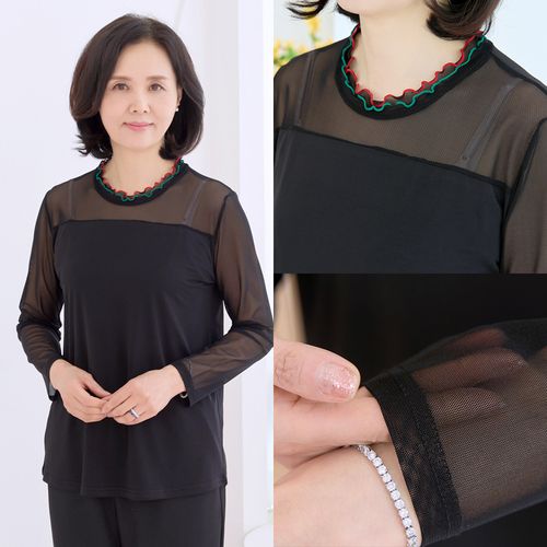 - 프릴 넥 시스루 블라우스 국내생산 망사 레이어드