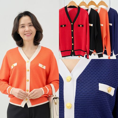 - 브이넥 오픈 가디건 면25 배색 금장 단추 와플