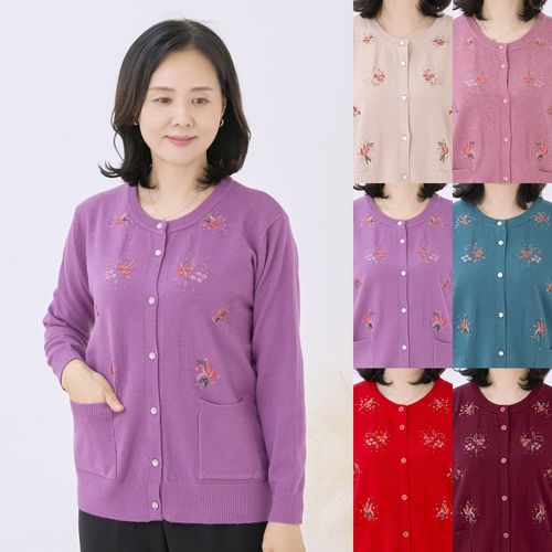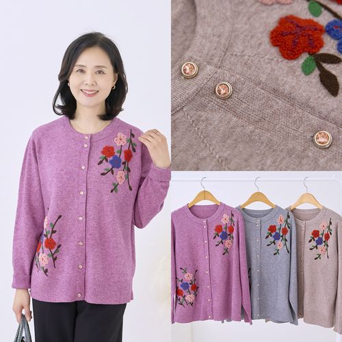 - 맘스 니트 가디건 자수 단추 주머니 라운드
